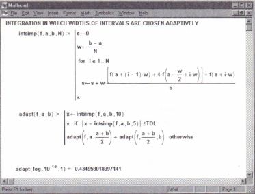 One way many programmers avoid overly complicated programs is to bury the complexity in a subroutine. Figure 18-13 shows how you can do something similar in Mathcad. By defining intsimp elsewhere and using it within adapt, the program used to define adapt becomes considerably simpler.